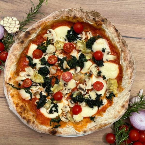 paradicsomszósz, articsóka, gomba, spenót, fokhagyma, koktélparadicsom, növényi sajt választható pizza tésztával