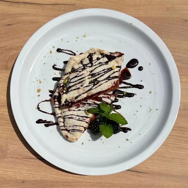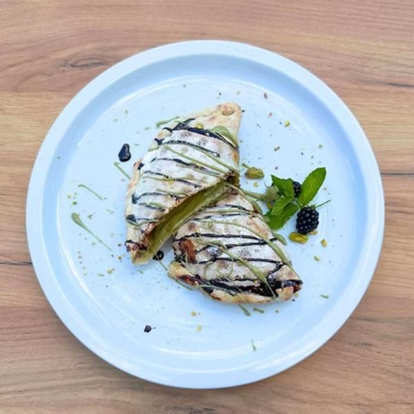 szarvasgombás alap, mortadella, bazsalikom, pisztácia, burrata sajt, mozzarella sajt, pesto választható pizza tésztával