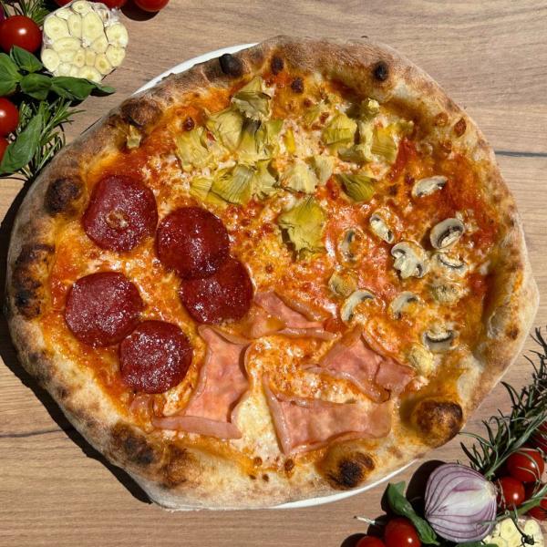 paradicsomszósz, olasz szalámi, sonka, gomba, articsóka, mozzarella sajt választható pizza tésztával