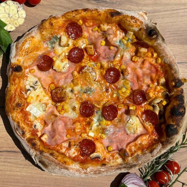 paradicsomszósz, sonka, kolbász, gomba, kukorica, lilahagyma, vegyes sajt, mozzarella sajt választható pizza tésztával