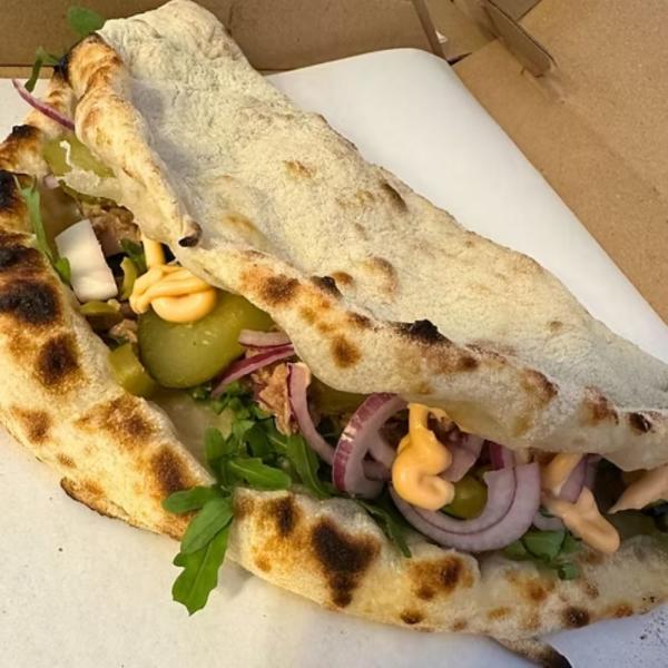 tonhal, rukkola, olajbogyó, csemegeuborka, lilahagyma, balzsamecet , házi szósz