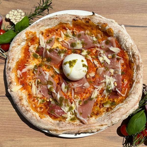 paradicsomszósz, pármai sonka, fenyőmag, burrata sajt, parmezán sajt, mozzarella sajt, bazsalikomos pesto választható pizza tésztával