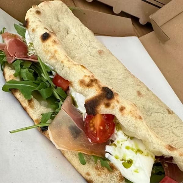 pármai sonka, rukkola, koktélparadicsom, kaliforniai paprika, burrata sajt, házi szósz, balzsamecet , bazsalikomos pesto