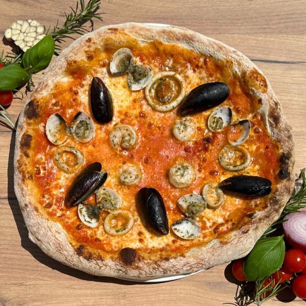 paradicsomszósz, tintahal, feketekagyló, garnélarák, mozzarella sajt választható pizza tésztával