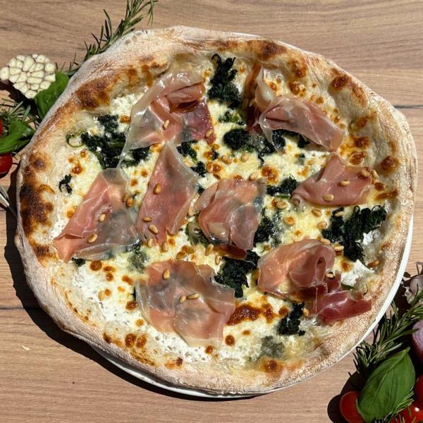 tejfölös alap, pármai sonka, spenót, fenyőmag, mozzarella sajt, gorgonzola sajt választható pizza tésztával