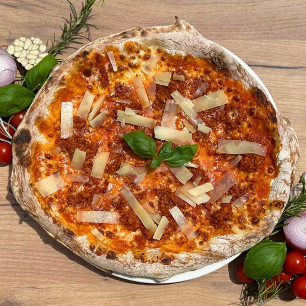 paradicsomszósz, bolognai ragu, parmezán sajt, mozzarella sajt választható pizza tésztával