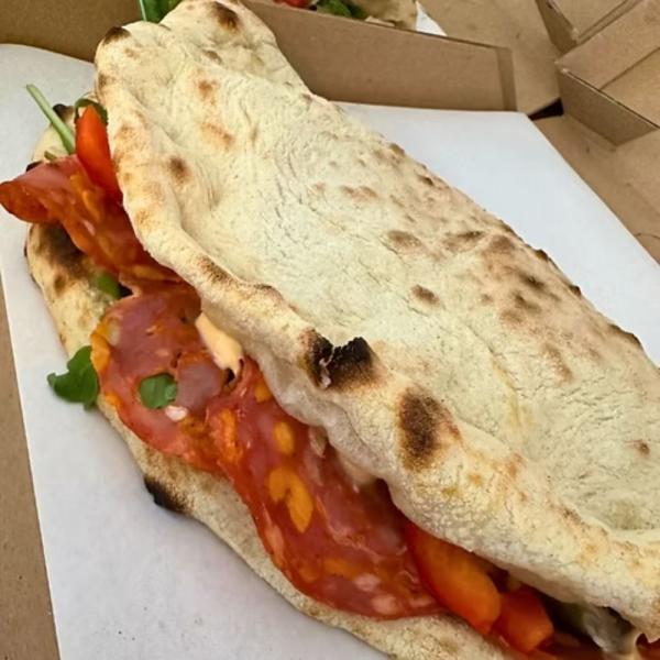 csípős olasz szalámi, rukkola, koktélparadicsom, kaliforniai paprika, jalapeno, cheddar sajt, balzsamecet , házi szósz