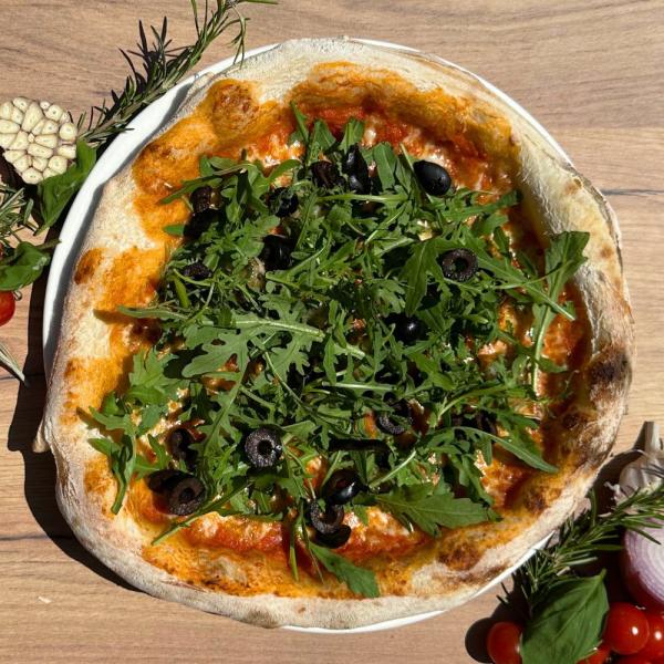 paradicsomszósz, garnélarák, rukkola, olívabogyó, mozzarella sajt választható pizza tésztával