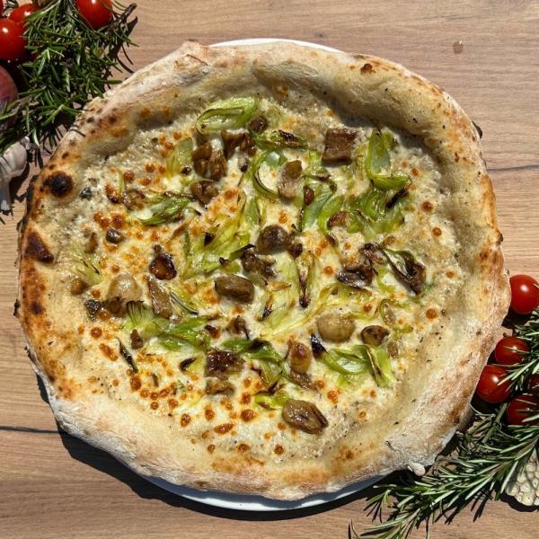 szarvasgombás-tejszínes alap, fokhagyma, póréhagyma, pirított vargánya, mozzarella sajt választható pizza tésztával