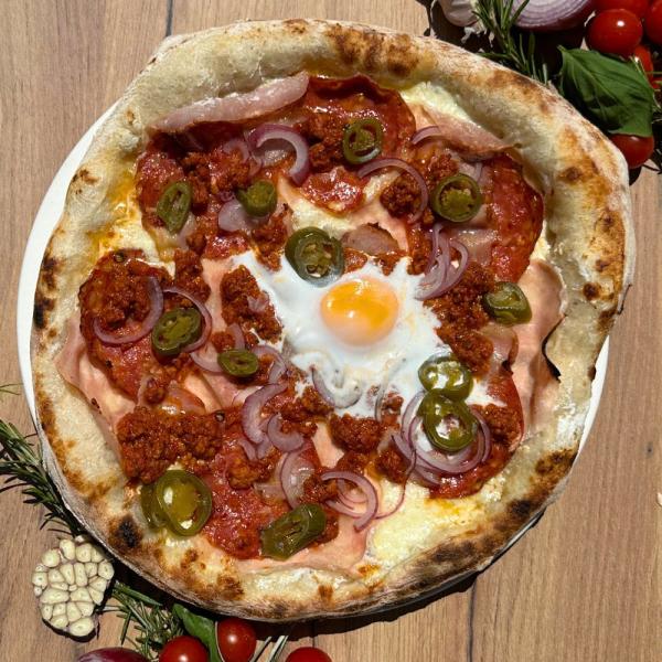 tejfölös alap, sonka, bacon, bolognai ragu, olasz csípős szalámi, jalapeno, lilahagyma, tükörtojás, mozzarella sajt választható pizza tésztával