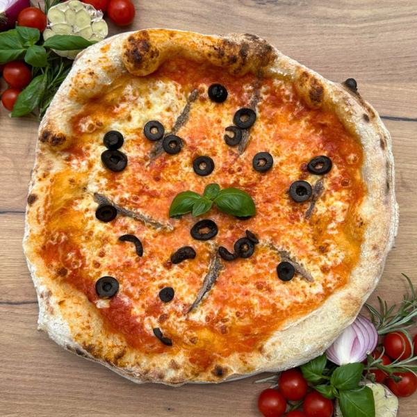 paradicsomszósz, szardella, olívabogyó, mozzarella sajt választható pizza tésztával
