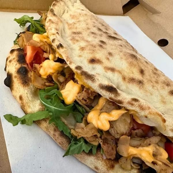 gyros hús csirkecombfiléből, rukkola, lilahagyma, koktélparadicsom, kaliforniai paprika, cheddar sajt, házi szósz